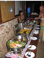 Im Sangat Beachfront Restaurant werden internationale Gerichte im Buffet Stil serviert. In der Bar werden exotische Cocktails, internationale Weine oder auch das berühmte einheimische San Miguel Bier ausgeschenkt. Die Sperrstunde bestimmen die Gäste.